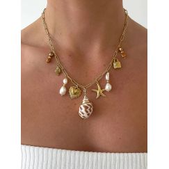 stainless steel necklace with multiple faux shell charms. Vintage-inspired coastal jewelry.